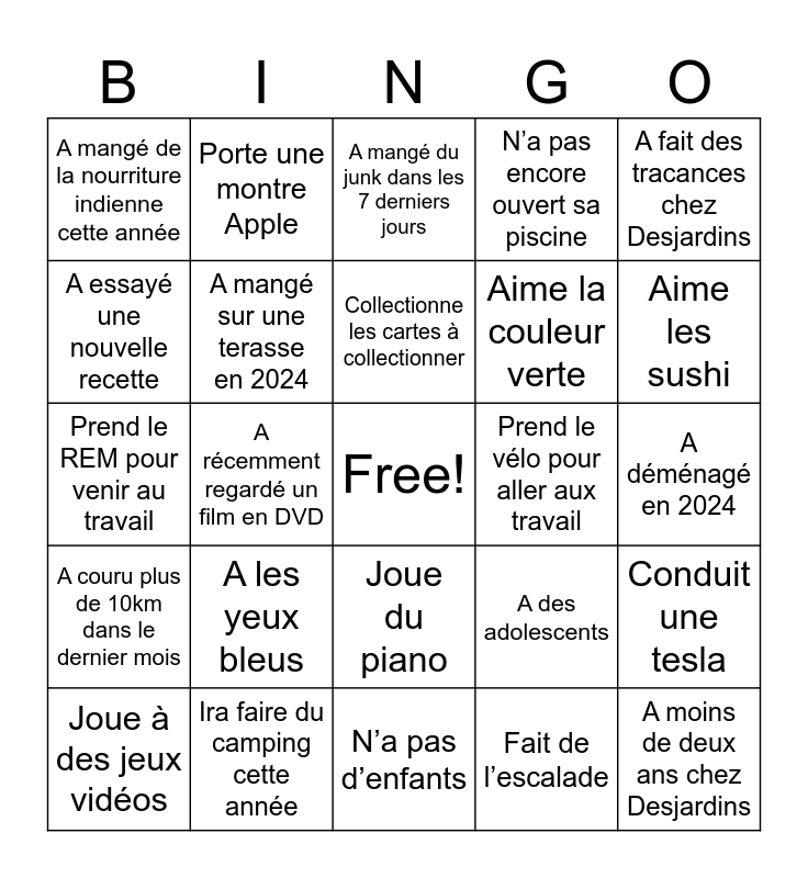 This bingo card has a free space and 24 words: A les yeux bleus, Ira faire du camping cette année, Collectionne les cartes à collectionner, Joue à des jeux vidéos, A fait des tracances chez Desjardins, A mangé de la nourriture indienne cette année, A essayé une nouvelle recette, Porte une montre Apple, Prend le vélo pour aller aux travail, Joue du piano, Aime la couleur verte, Prend le REM pour venir au travail, A des adolescents, Conduit une tesla, A mangé sur une terasse en 2024, Fait de l’escalade, A déménagé en 2024, A mangé du junk dans les 7 derniers jours, Aime les sushi, A récemment regardé un film en DVD, A moins de deux ans chez Desjardins, A couru plus de 10km dans le dernier mois, N’a pas encore ouvert sa piscine and N’a pas d’enfants.