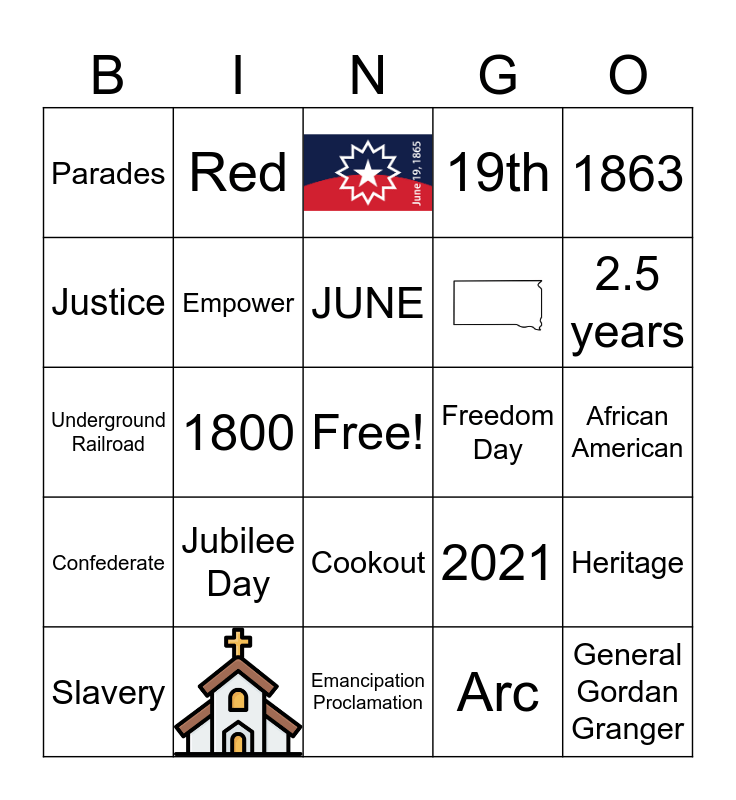 This bingo card has 3 images, a free space and 21 words: Jubilee Day, JUNE, Slavery, 1863, Parades, Justice, Red, Freedom Day, Cookout, Underground Railroad, 2021, Heritage, Empower, Arc, African American, 2.5 years, 1800, General Gordan Granger, Confederate, 19th and Emancipation Proclamation.