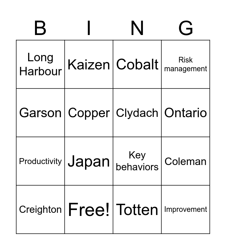 This bingo card has 28 words: Homesafe, Safety, Productivity, Nickel, Copper, Cobalt, Kaizen, Improvement, Free!, Performance, Key behaviors, Risk management, Active listening, Open Dialogue, Japan, Canada, United Kingdom, Clydach, Ontario, Manitoba, Long Harbour, Voisey's bay, Creighton, Coleman, Totten, Copper Cliff, Garson and Thompson.