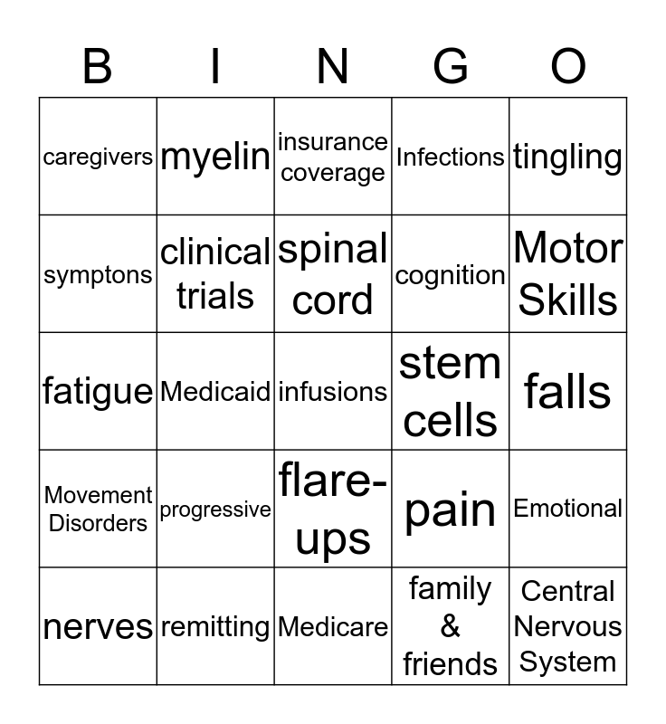 This bingo card has a free space and 24 words: progressive, remitting, spinal cord, nerves, tingling, caregivers, symptons, myelin, stem cells, flare-ups, cognition, fatigue, pain, Emotional, clinical trials, family & friends, falls, insurance coverage, Motor Skills, Medicaid, Central Nervous System, Movement Disorders, Infections and Medicare.