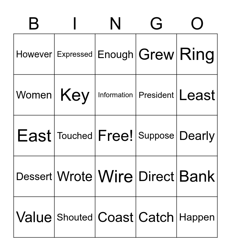 This bingo card has a free space and 35 words: Row, Choose, Serve, Key, Wire, Grew, Women, Climbed, Information, Increased, East, Ring, Cents, Period, However, Suppose, Catch, Touched, Dessert, Happen, Direct, Value, Bank, Shouted, Enough, Least, Single, Child, President, Dearly, Skin, Coast, Wrote, Expressed and Again.