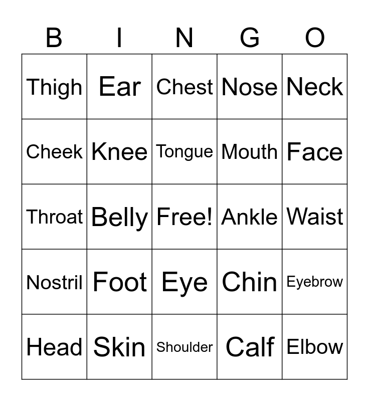 This bingo card has a free space and 29 words: Head, Body, Belly, Arm, Thigh, Chest, Knee, Foot, Ankle, Skin, Waist, Elbow, Shoulder, Calf, Face, Forehead, Eye, Nostril, Neck, Throat, Chin, Lip, Mouth, Cheek, Nose, Ear, Eyebrow, Tongue and Tooth.
