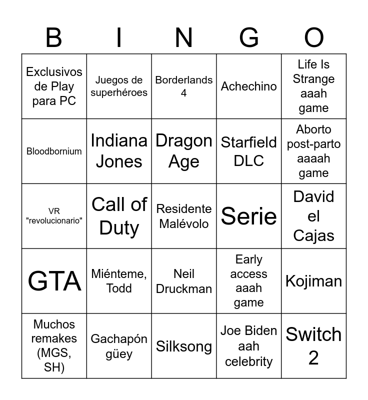 This bingo card has 25 words: Miénteme, Todd, Silksong, Dragon Age, Muchos remakes (MGS, SH), Life Is Strange aaah game, Exclusivos de Play para PC, Bloodbornium, Juegos de superhéroes, Serie, Neil Druckman, Starfield DLC, VR "revolucionario", Early access aaah game, Kojiman, Indiana Jones, Switch 2, David el Cajas, Borderlands 4, Aborto post-parto aaaah game, Call of Duty, Residente Malévolo, Gachapón güey, GTA, Achechino and Joe Biden aah celebrity.
