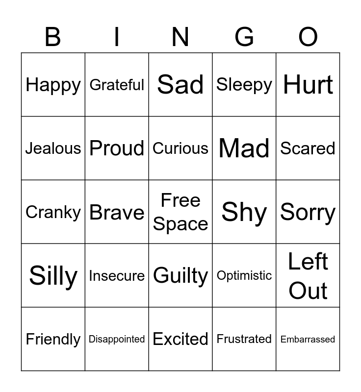 This bingo card has a free space and 28 words: Surprised, Disappointed, Curious, Frustrated, Hurt, Happy, Proud, Excited, Shy, Left Out, Cranky, Brave, Optimistic, Embarrassed, Jealous, Sensitive, Guilty, Sleepy, Scared, Friendly, Grateful, Kind, Mad, Sorry, Silly, Insecure, Sad and Uncomfortable.