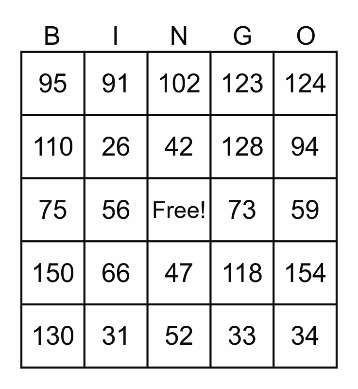 This bingo card has a free space and 130 words: 25, 26, 27, 28, 29, 30, 31, 32, 33, 34, 35, 36, 38, 39, 40, 41, 37, 43, 44, 45, 46, 42, 48, 49, 50, 51, 47, 53, 54, 55, 56, 52, 58, 59, 60, 61, 57, 63, 64, 65, 66, 62, 68, 69, 70, 71, 67, 73, 74, 75, 76, 72, 78, 79, 80, 81, 77, 83, 84, 85, 86, 82, 88, 89, 90, 91, 87, 93, 94, 95, 96, 92, 98, 99, 100, 101, 97, 103, 104, 105, 106, 102, 108, 109, 110, 111, 107, 113, 114, 115, 116, 112, 118, 119, 120, 121, 117, 123, 124, 125, 126, 122, 128, 129, 130, 131, 127, 133, 134, 135, 136, 132, 138, 139, 140, 141, 137, 143, 144, 145, 146, 142, 148, 149, 150, 151, 147, 153, 154 and 152.
