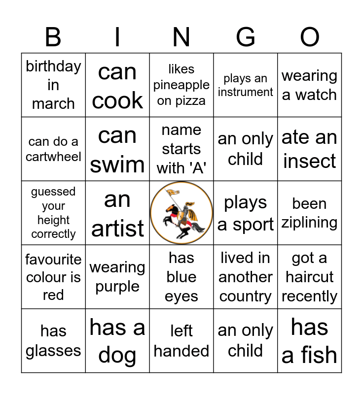 This bingo card has a free space and 24 words: wearing purple, has a dog, name starts with 'A', has glasses, wearing a watch, birthday in march, can do a cartwheel, can cook, plays a sport, has blue eyes, an only child, guessed your height correctly, lived in another country, got a haircut recently, can swim, an only child, been ziplining, likes pineapple on pizza, ate an insect, an artist, has a fish, favourite colour is red, plays an instrument and left handed.