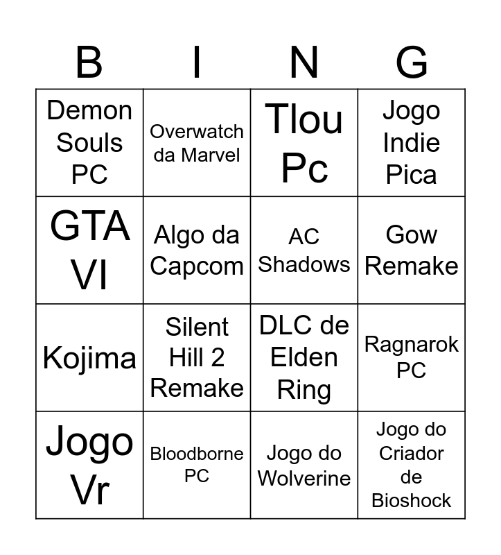This bingo card has 16 words: Bloodborne PC, Ragnarok PC, Tlou Pc, Demon Souls PC, Kojima, Overwatch da Marvel, DLC de Elden Ring, Jogo do Wolverine, GTA VI, Algo da Capcom, Jogo Vr, Jogo Indie Pica, Silent Hill 2 Remake, Gow Remake, AC Shadows and Jogo do Criador de Bioshock.