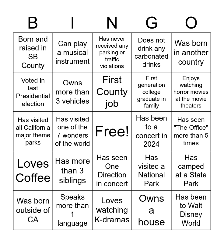 This bingo card has a free space and 24 words: Has more than 3 siblings, Speaks more than 1 language, First County job, Was born outside of CA, Was born in another country, Born and raised in SB County, Voted in last Presidential election, Can play a musical instrument, Has been to a concert in 2024, Has seen One Direction in concert, First generation college graduate in family, Has visited all California major theme parks, Has visited a National Park, Has camped at a State Park, Owns more than 3 vehicles, Owns a house, Has seen "The Office" more than 5 times, Has never received any parking or traffic violations, Enjoys watching horror movies at the movie theaters, Has visited one of the 7 wonders of the world, Has been to Walt Disney World, Loves Coffee, Does not drink any carbonated drinks and Loves watching K-dramas.