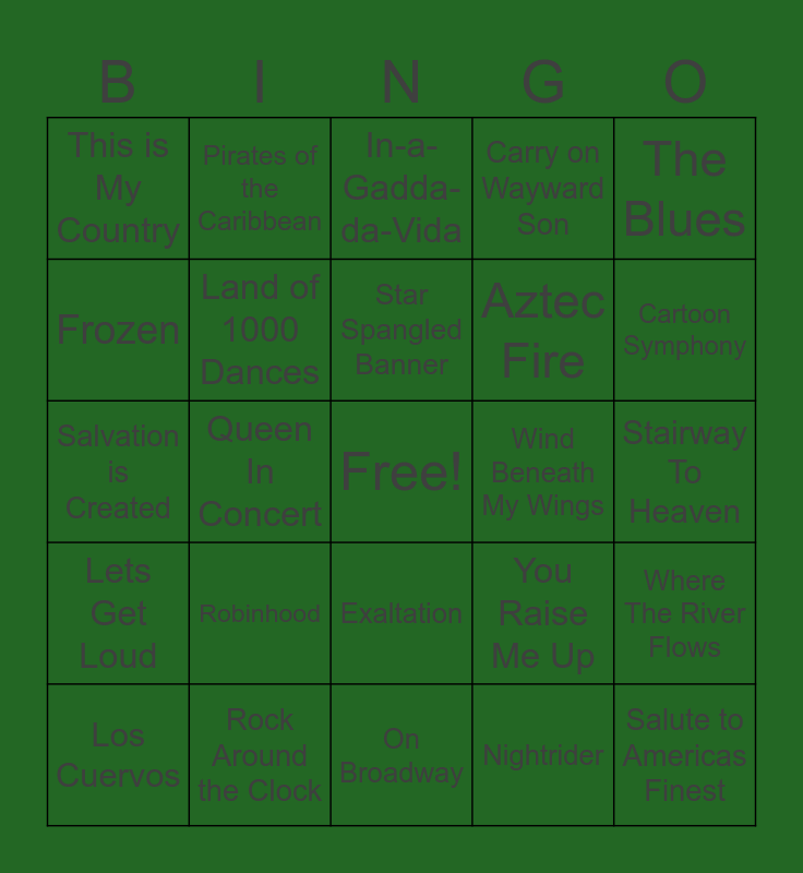 This bingo card has a free space and 72 words: Just Give Me a Reason, Pirates of the Caribbean, Queen In Concert, Greatest Showman, Knock on Wood, Candle on the Water, Carry on Wayward Son, Beautiful Ohio, Aztec Fire, Zoot Suit Riot, Los Cuervos, Slide Show, Cartoon Symphony, This is My Country, Take Me Home Country Roads, Salvation is Created, You Raise Me Up, The Blues, Disneyland Celebration, Stairway To Heaven, Robinhood, Salute to Americas Finest, Where The River Flows, Fanfare and Hymn of Brotherhood, Comedy Classics, Amazing Grace, Bare Necessities, Glee Showstoppers, Frankenstein, Moana, Rock Around the Clock, You Decorated My Life, How to Train your Dragon, Boogie Down, Nightrider, Endless Love, Crazy Little Thing, Wings, Frozen, Black Panther, Exaltation, Land of Make Believe, Stars and Stripes Forever, Yakety March, Work Song/End of the Day, Lets Get Loud, I've Had the Time of My Life, Battle Hymn of the Republic, Shallow, Lemon Merengue, Born This Way, Aladdin, Right Round, Wind Beneath My Wings, Hard to Say I'm Sorry/Get Away, A Groovy Kind of Love, In-a-Gadda-da-Vida, Star Spangled Banner, Avengers, Fire Dance, Forrest Gump Suite, Blue Collar Man, Light Eternal, On Broadway, Build Me Up Buttercup, Jump, Jive, & Wail, Land of 1000 Dances, Don't Stop Believing, Gamelan, Game of Thrones, Hey Jude and Counting Stars.