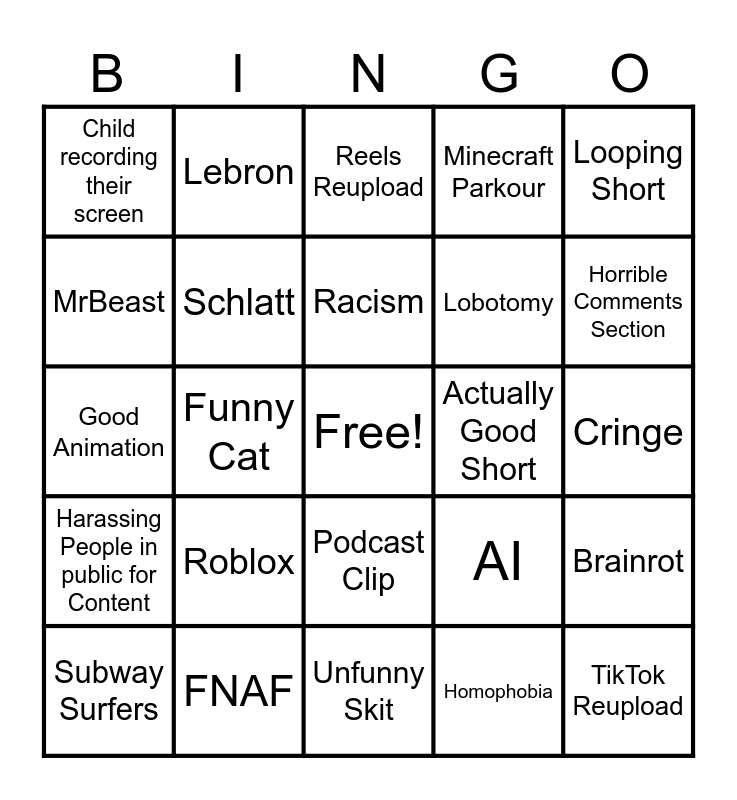 This bingo card has a free space and 24 words: Roblox, FNAF, Racism, Subway Surfers, Looping Short, Child recording their screen, MrBeast, Lebron, Actually Good Short, Podcast Clip, Lobotomy, Good Animation, AI, Brainrot, Schlatt, Homophobia, Cringe, Reels Reupload, Horrible Comments Section, Funny Cat, TikTok Reupload, Harassing People in public for Content, Minecraft Parkour and Unfunny Skit.