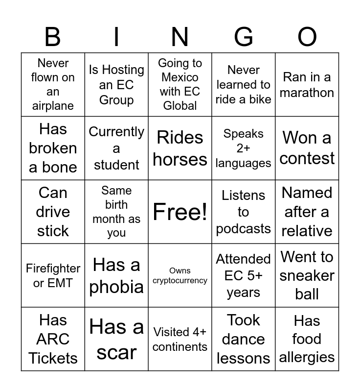 This bingo card has a free space and 29 words: Has ARC Tickets, Works remotely, Same birth month as you, Owns same car brand as you, Never flown on an airplane, Going to Mexico with EC Global, Currently a student, Has a phobia, Listens to podcasts, Has a scar, Named after a relative, Has food allergies, Visited 4+ continents, Took dance lessons, Won a contest, Can do basic car repairs, Owns cryptocurrency, Firefighter or EMT, Ran in a marathon, Can drive stick, Attended EC 5+ years, Climbed a mountain, Speaks 2+ languages, Has broken a bone, Never learned to ride a bike, Is Hosting an EC Group, Went to sneaker ball, Rides horses and Can do a cartwheel.