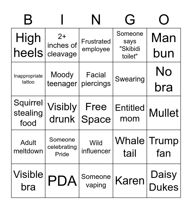 This bingo card has a free space and 24 words: Someone celebrating Pride, PDA, Facial piercings, Visible bra, Man bun, High heels, Inappropriate tattoo, 2+ inches of cleavage, Entitled mom, Wild influencer, Swearing, Squirrel stealing food, Whale tail, Trump fan, Moody teenager, Karen, Mullet, Frustrated employee, No bra, Visibly drunk, Daisy Dukes, Adult meltdown, Someone says "Skibidi toilet" and Someone vaping.