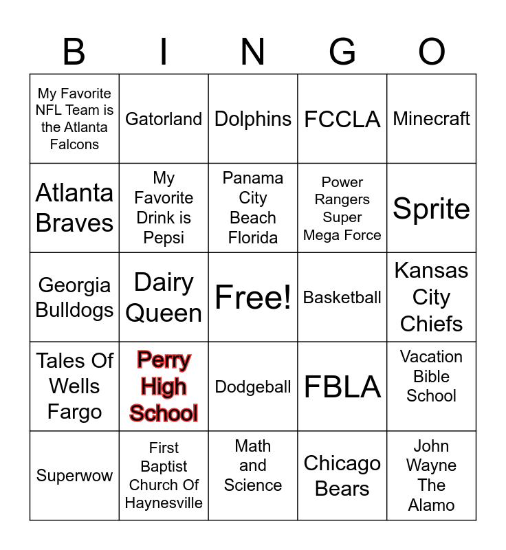 This bingo card has a free space and 24 words: Perry High School, First Baptist Church Of Haynesville, Panama City Beach Florida, Superwow, Minecraft, My Favorite NFL Team is the Atlanta Falcons, Atlanta Braves, Gatorland, Basketball, Dodgeball, Power Rangers Super Mega Force, Georgia Bulldogs, FBLA, Vacation Bible School, My Favorite Drink is Pepsi, Chicago Bears, Kansas City Chiefs, Dolphins, Sprite, Dairy Queen, John Wayne The Alamo, Tales Of Wells Fargo, FCCLA and Math and Science.