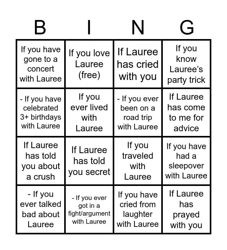 This bingo card has 19 words: If you traveled with Lauree, If you have gotten drunk with Lauree, If Lauree has cried with you, If Lauree has prayed with you, If you have had a sleepover with Lauree, - If you have celebrated 3+ birthdays with Lauree, If you have cried from laughter with Lauree, If you have gone to a concert with Lauree, If you love Lauree (free), If Lauree has told you about a crush, If Lauree has told you secret, If you ever lived with Lauree, - If you ever been on a road trip with Lauree, - If you ever got in a fight/argument with Lauree, - If you ever talked bad about Lauree, - If I know one of Lauree’s all time fav songs, If you know Lauree’s party trick, If Lauree has come to me for advice and If you could describe Lauree in one word.