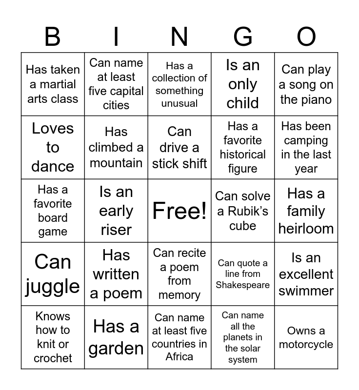 This bingo card has a free space and 115 words: Has traveled to a different continent, Speaks more than two languages, Plays a musical instrument, Has met a celebrity, Loves to cook, Has a tattoo, Is an only child, Has broken a bone, Is afraid of spiders, Has a food allergy, Loves to read science fiction, Has been skydiving, Is a vegetarian or vegan, Has attended a concert in the past year, Can whistle a tune, Has never gotten a speeding ticket, Can recite a poem from memory, Has gone scuba diving, Has won a contest or competition, Has been in a play or musical, Knows how to knit or crochet, Has a collection of something unusual, Prefers tea over coffee, Can play chess, Has seen a solar eclipse, Can juggle, Has a garden, Has donated blood, Has a birthday in December, Loves spicy food, Has been camping in the last year, Can drive a stick shift, Is an early riser, Prefers winter over summer, Has a family member in the military, Loves horror movies, Has never seen snow in person, Has been to a professional sports game, Can bake a cake from scratch, Knows how to change a tire, Has dyed their hair a bright color, Prefers cats over dogs, Has never broken a bone, Has a fear of heights, Has never flown in an airplane, Is a fan of comic books, Can name all the planets in the solar system, Loves to dance, Has an unusual hobby, Can touch their toes without bending their knees, Has volunteered for a charity, Can solve a Rubik’s cube, Prefers books over movies, Can do a cartwheel, Loves pineapple on pizza, Has ridden a horse, Knows how to sew, Prefers chocolate over vanilla, Can run 5 miles, Has read all the Harry Potter books, Is an excellent swimmer, Has never been on a roller coaster, Has never been to the beach, Can identify at least five types of trees, Has a favorite quote, Has participated in a protest or march, Prefers sunrise over sunset, Has climbed a mountain, Has a favorite board game, Has taken a pottery class, Has a family heirloom, Can perform a magic trick, Has been to a wine tasting, Prefers savory over sweet snacks, Has a phobia of snakes, Owns a motorcycle, Has written a poem, Has taken a martial arts class, Can identify at least five bird species, Can make origami, Has built a piece of furniture, Can name at least five capital cities, Has run a 10K, Can quote a line from Shakespeare, Has a favorite historical figure, Has visited a national park, Has taken a yoga class, Has done a random act of kindness, Knows how to play poker, Has been on a zip line, Can name at least five flowers, Has ridden a camel, Loves roller coasters, Has taken a dance class, Can play a song on the piano, Has been to a film festival, Has been to a political rally, Has visited a fort, Prefers the mountains over the beach, Can speak with an accent, Has made a YouTube video, Has seen a shooting star, Prefers fiction over non-fiction books, Knows how to play Sudoku, Has been on a safari, Can name all the oceans, Has been to a botanical garden, Has taken a road trip on a motorcycle, Can name at least five countries in Africa, Has visited a lighthouse, Can make a paper airplane, Has been to an aquarium in the past year, Has been to a farmer’s market in the past month, Has participated in a book club and Prefers dogs over cats.