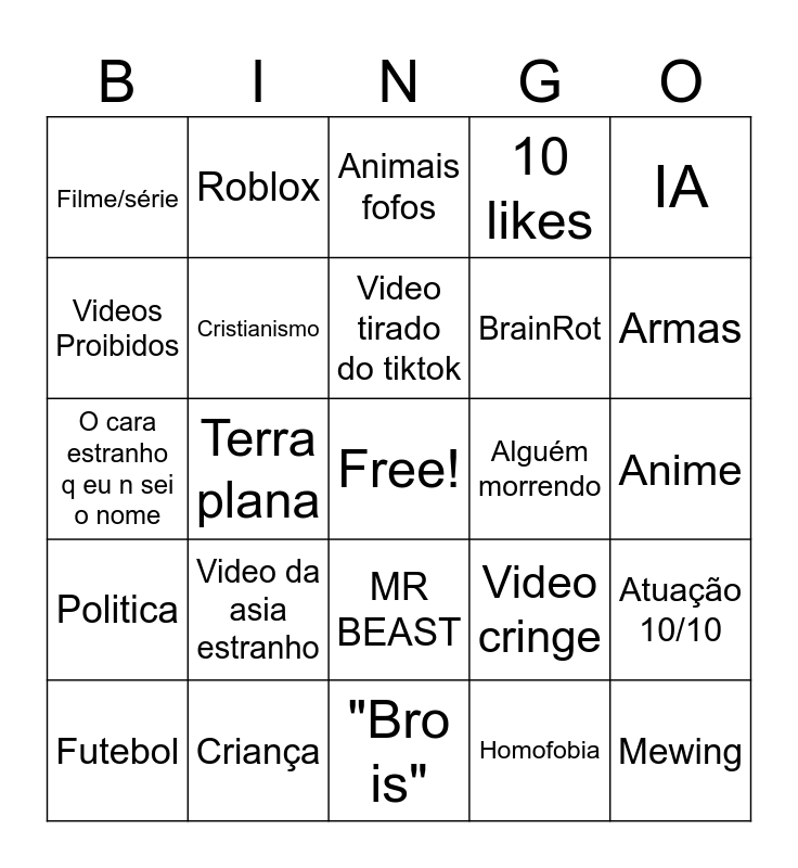 This bingo card has a free space and 24 words: Video da asia estranho, Criança, Video tirado do tiktok, Futebol, IA, Filme/série, Videos Proibidos, Roblox, Alguém morrendo, MR BEAST, BrainRot, O cara estranho q eu n sei o nome, Video cringe, Atuação 10/10, Cristianismo, Homofobia, Anime, Animais fofos, Armas, Terra plana, Mewing, Politica, 10 likes and "Bro is".