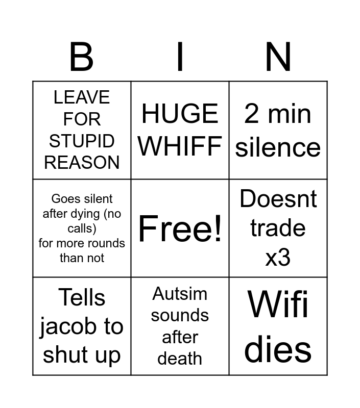 This bingo card has a free space and 8 words: Doesnt trade x3, 2 min silence, HUGE WHIFF, Tells jacob to shut up, LEAVE FOR STUPID REASON, Wifi dies, Goes silent after dying (no calls) for more rounds than not and Autsim sounds after death.