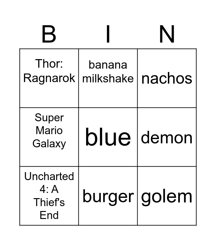 This bingo card has 9 words: Uncharted 4: A Thief's End, nachos, banana milkshake, Super Mario Galaxy, Thor: Ragnarok, demon, blue, golem and burger.
