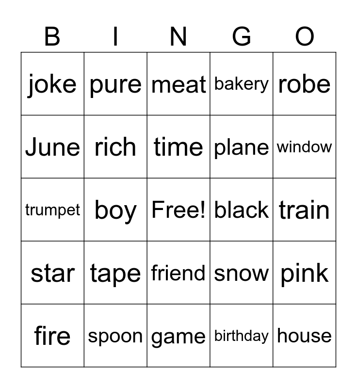 This bingo card has a free space and 25 words: tape, game, time, fire, robe, joke, June, pure, black, friend, plane, trumpet, snow, pink, rich, photo, train, meat, window, boy, house, spoon, star, bakery and birthday.