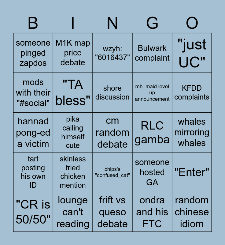 This bingo card has 48 words: Free!, cm random debate, cm poem of the day, frift vs queso debate, skinless fried chicken mention, restricted account update, M1K map price debate, new pin of shame, mods with their "#social", whales flexing portfolio, "TA bless", Bulwark complaint, "Enter", someone hosted GA, mod rig, "im poor", shore discussion, RLC gamba, bzan mapping here, "just UC", pika calling himself cute, ondra and his FTC, someone pinged zapdos, mh_maid level up announcement, cm's AI generated images, KFDD complaints, "CR is 50/50", daily food talk, chips's "confused_cat", tart posting his own ID, UMR's ":jerry:", zod dysoning MP, Hiari using ugly emoji, clover bullied in lounge, lounge can't reading, CME :kekw:, ronza talk, whales mirroring whales, unDaniel's Good Morning, cat GIFs, "just swipe", random chinese idiom, wzyh: "6016437", "skill issue", hannad pong-ed a victim, Jeffry's *italics*, Squirtle's "uwu" and Sien update whel list.