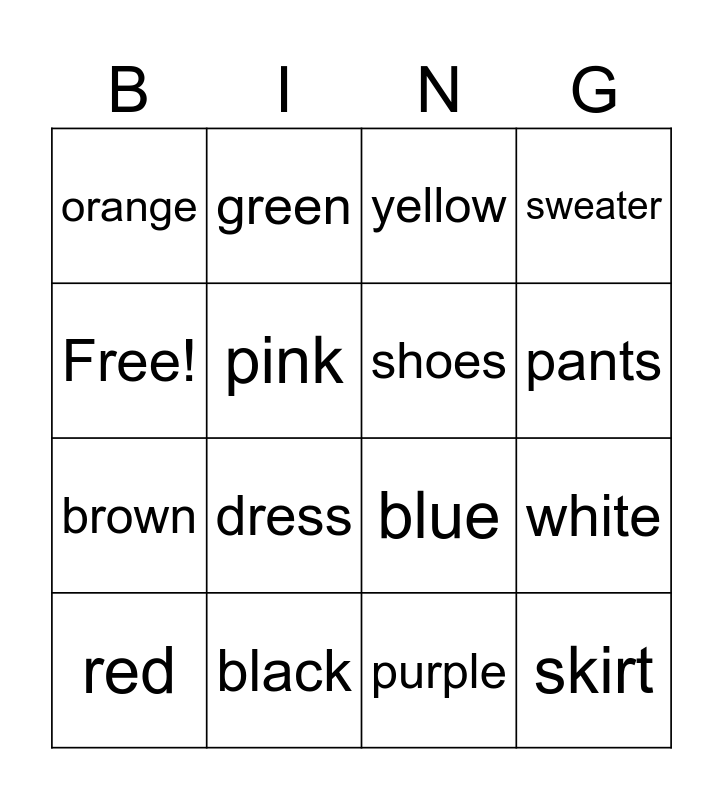 This bingo card has 16 words: black, white, yellow, orange, brown, green, blue, purple, Free!, pink, red, sweater, dress, pants, shoes and skirt.