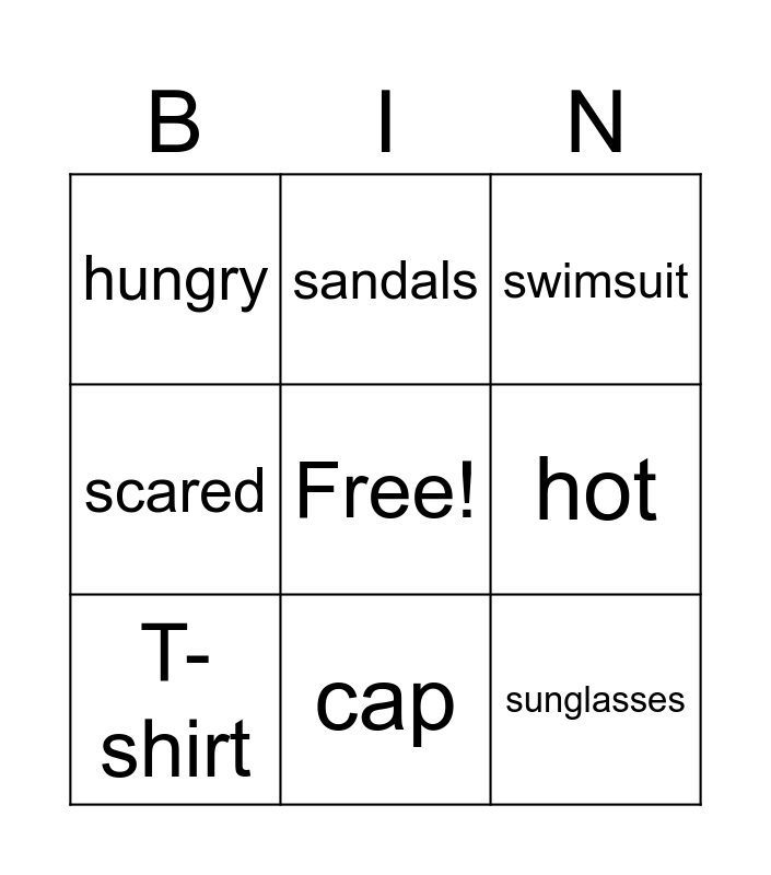 This bingo card has a free space and 11 words: skirt, cap, sunglasses, T-shirt, sandals, swimsuit, hot, shorts, scared, hungry and thirsty.