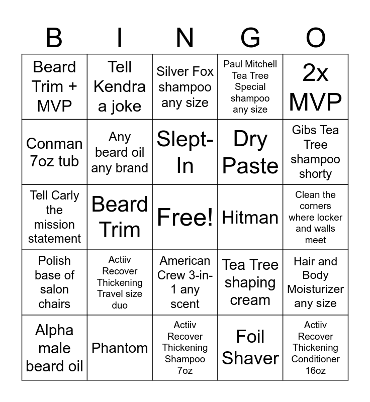 This bingo card has a free space and 51 words: Actiiv Recover Thickening Shampoo 16oz, Actiiv Recover Thickening Conditioner 16oz, Actiiv Recover Thickening Conditioner 7oz, Actiiv Recover Thickening Shampoo 7oz, Actiiv Recover Thickening Travel size duo, Actiiv Thickening hair serum Water based, Tell Kendra a joke, Biofuel 12 oz, Conman 7oz tub, Black Kodiak, Any beard oil any brand, Paul Mitchell Tea Tree Special shampoo any size, Hair and Body Moisturizer any size, Tea Tree shaping cream, OG Baller, GIBS Tea Tree Matte Cream, Slept-In, Hitman, 3x MVP, 2x MVP, Beard Trim, Foil Shaver, Beard Trim + MVP, Dry Paste, Tell Carly a joke, El Ray Shorty, Gibs Tea Tree shampoo shorty, Gibs Tea Tree conditioner shorty, Alpha male beard oil, Silver Fox shampoo any size, American crew purple shampoo, Any Glop and Glam prodcut, Free Neck Trim, MVP, Tactical Texture, Phantom, Outlaw, Waterwax, Conman Shorty, Dust the fans, Clean the corners where locker and walls meet, Polish base of salon chairs, Top Down any size, Top Down Shorty, Ask Tabby the 3 key questions, Ask a team mate what the heart of a champion is, Tell Carly the mission statement, nominate a team member for a quarterly award, Preform a random act of kindness for a team member, American Crew 3-in-1 any scent and Liter of any product.