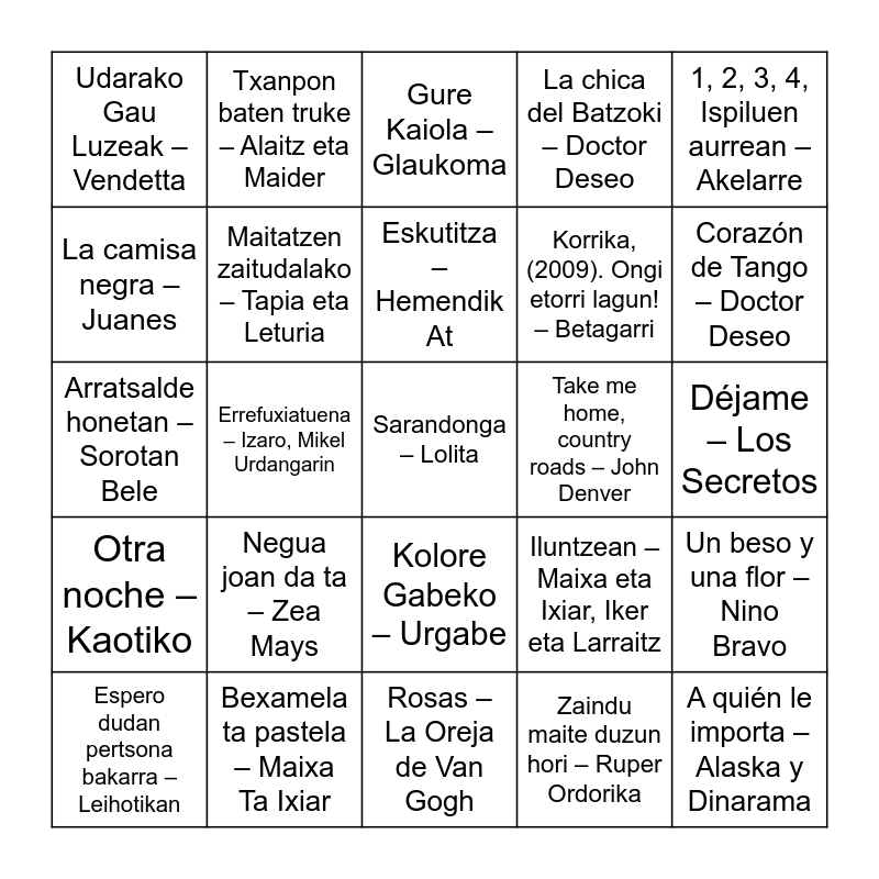 This bingo card has 101 words: Free!, Hegal egiten - Itoiz, 1, 2, 3, 4, Ispiluen aurrean – Akelarre, Eperra – Anje Duhalde, Hay que venir al sur – Raffaella Carrà, Vivir así es morir de amor – Camilo Sesto, Chica Yeye – Concha Velasco, Besos – El Canto del Loco, Dancing Queen – ABBA, Aitormena – Hertzainak, Zoratzen naizela – Hertzainak, Caballo Prieto Azabache – Puro Relajo, La Adelita – Puro Relajo, Urepel – Gatibu, Ilargia – Ken Zazpi, Aurkitu zintudan – Exkixu, Otra noche – Kaotiko, Nostalgia – Kauta, Ikusi arte – Berri Txarrak, Guregatik – Hesian, Itxaropena – Su Ta Gar, Betazalak erauztean – Katamalo, Burua hotz eta bihotza bero – Des-Kontrol, Besos de Kubata – Txapelpunk, Amets – Gari, Corazón de Tango – Doctor Deseo, La chica del Batzoki – Doctor Deseo, Negua joan da ta – Zea Mays, Kantuz eskertu – Ze Esatek!, Orain – Hemendik At, Txanpon baten truke – Alaitz eta Maider, Gure Kaiola – Glaukoma, Zure doinua – Lor, Kalanbreak – Gozategi, Ez gaitu inork geldituko – Urtz, Kolore Gabeko – Urgabe, Soldadito marinero – Fito y Fitipaldis, Kaliek hutsik – Txoriburu Produkzions, Zaindu maite duzun hori – Ruper Ordorika, Rosas – La Oreja de Van Gogh, Bart – Sarkor, Espero dudan pertsona bakarra – Leihotikan, Y yo sigo aquí – Paulina Rubio, Colgando en tus manos – Carlos Baute, Marta Sánchez, El Rey – Vicente Fernández, Sarandonga – Lolita, I wanna dance with somebody – Whitney Houston, Don’t stop me now – Queen, Suavemente – Elvis Crespo, A quién le importa – Alaska y Dinarama, Mi gran noche – Raphael, La camisa negra – Juanes, Kantu bat – Bulego, Maite zaitut - Pirritx, Porrotx eta Marimotots, Baloreak – Baloreak, Tabernako argiak – Mconak, Eskola Txikiak – Pirritx, Porrotx eta Marimotots, Bizkaia maite – Benito Lertxundi, Ai ze polita – Jokaldi, Welcome of Beach – Gozategi, Maitatzen zaitudalako – Tapia eta Leturia, Horrelako – The Uski’s, Astronauta Tronpeta Flauta – Ene Kantak, Brigi Duke, I’ll be there for you (Friends) – The Rembrandts, Hips Don’t Lie – Shakira, Korrika, (2009). Ongi etorri lagun! – Betagarri, Rayando el sol – Maná, Errefuxiatuena – Izaro, Mikel Urdangarin, Bexamela ta pastela – Maixa Ta Ixiar, Gogoak – Esne Beltza, Zurekin Batera – En Tol Sarmiento, Itzulera – Zetak, Erramun Martikorena, Udarako Gau Luzeak – Vendetta, Despechá – Rosalía, Eskutitza – Hemendik At, Arratsalde honetan – Sorotan Bele, Eskuetan – Pirritx, Porrotx eta Marimotots, Zarena Zarelako – Sugan, Euskal Herrian Euskaraz – Oskorri, Bagare – Gontzal Mendibil eta Xeberri, Material Girl – 2024 Remaster – Madonna, Sweet Caroline – Neil Diamond, Take me home, country roads – John Denver, Serenade – Dover, Euskararen Txantxangorria – Go!azen, Aspaldiko Loreak – EH Sukarra, Déjame – Los Secretos, Teoria bat – Gorka Urbizu, Gu geu garena – El Tol Sarmiento, Süne, Aioiai – Neomak, Iluntzean – Maixa eta Ixiar, Iker eta Larraitz, Laztana - Latzen, Glastonbury - Nogen, Ni tú ni nadie – Alaska y Dinarama, Mamma mia – ABBA, Un beso y una flor – Nino Bravo, Lepoan hartu ta segi aurrera – Pantxoa eta Peio, Rimmel – Gose, You’re the one that I want – Grease, Loiolan jai jai – Egan and Itsasontzi baten - Kaxiano.