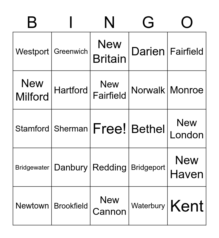 This bingo card has a free space and 24 words: Danbury, Brookfield, New Fairfield, Newtown, Fairfield, Westport, New Milford, Greenwich, Bethel, Redding, Norwalk, Stamford, Bridgeport, New Haven, Hartford, Waterbury, New London, New Britain, Monroe, Sherman, Kent, Bridgewater, Darien and New Cannon.
