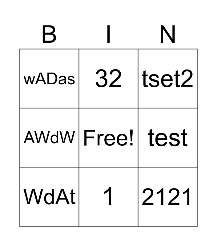 This bingo card has a free space and 8 words: test, tset2, 32, WdAt, wADas, 2121, AWdW and 1.