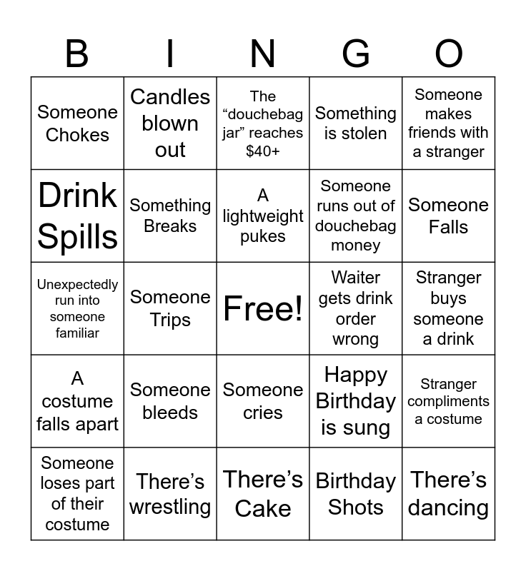 This bingo card has a free space and 24 words: Someone bleeds, There’s wrestling, A lightweight pukes, Someone loses part of their costume, Someone makes friends with a stranger, Someone Chokes, Drink Spills, Candles blown out, Waiter gets drink order wrong, Someone cries, Someone runs out of douchebag money, Unexpectedly run into someone familiar, Happy Birthday is sung, Stranger compliments a costume, Something Breaks, Birthday Shots, Stranger buys someone a drink, The “douchebag jar” reaches $40+, Someone Falls, Someone Trips, There’s dancing, A costume falls apart, Something is stolen and There’s Cake.