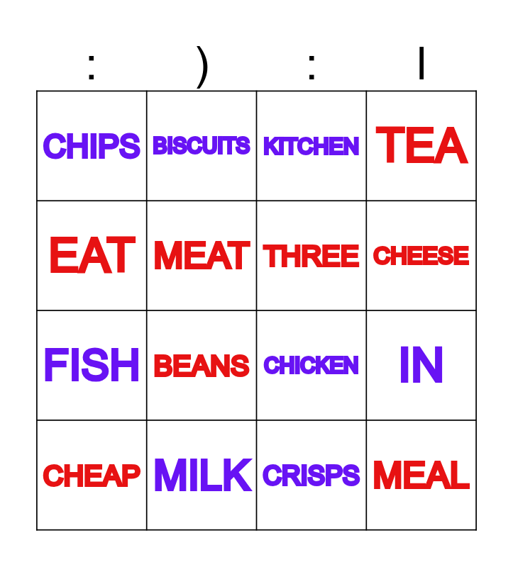 This bingo card has 16 words: MILK, IN, KITCHEN, CHIPS, FISH, BISCUITS, CHICKEN, CRISPS, EAT, MEAT, CHEAP, TEA, BEANS, CHEESE, THREE and MEAL.