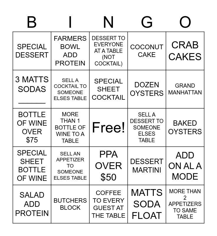 This bingo card has a free space and 26 words: PPA OVER $50, MATTS SODA FLOAT, SPECIAL SHEET COCKTAIL, BUTCHERS BLOCK, CRAB CAKES, SPECIAL DESSERT, 3 MATTS SODAS ______, FARMERS BOWL ADD PROTEIN, BAKED OYSTERS, DESSERT MARTINI, DOZEN OYSTERS, BOTTLE OF WINE OVER $75, ADD ON AL A MODE, SALAD ADD PROTEIN, MORE THAN 1 BOTTLE OF WINE TO A TABLE, PELLEGRINO, COCONUT CAKE, SPECIAL SHEET BOTTLE OF WINE, DESSERT TO EVERYONE AT A TABLE (NOT COCKTAIL), MORE THAN 2 APPETIZERS TO SAME TABLE, GRAND MANHATTAN, COFFEE TO EVERY GUEST AT THE TABLE, SELL A DESSERT TO SOMEONE ELSES TABLE, SELL AN APPETIZER TO SOMEONE ELSES TABLE, SELL A COCKTAIL TO SOMEONE ELSES TABLE and MOST EXPENSIVE FISHBOARD OFFERING OF THE DAY.