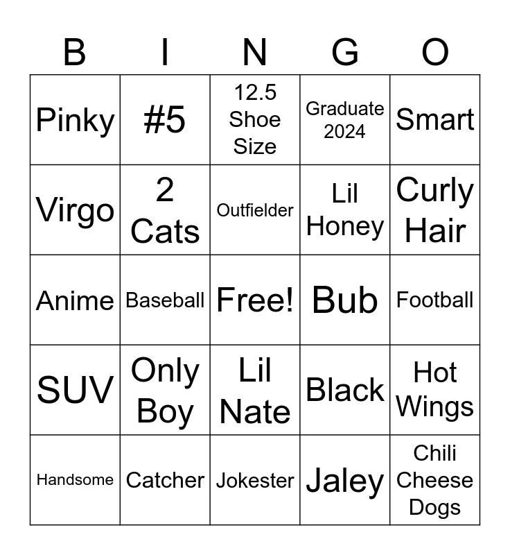 This bingo card has a free space and 24 words: Only Boy, Catcher, Outfielder, Handsome, Smart, Pinky, Virgo, #5, Bub, Lil Nate, Lil Honey, Anime, Black, Hot Wings, 2 Cats, Jaley, Football, 12.5 Shoe Size, Curly Hair, Baseball, Chili Cheese Dogs, SUV, Graduate 2024 and Jokester.