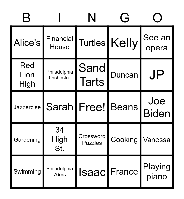 This bingo card has a free space and 24 words: 34 High St., Philadelphia 76ers, Sand Tarts, Swimming, See an opera, Alice's, Red Lion High, Financial House, Beans, Crossword Puzzles, Duncan, Jazzercise, Cooking, Vanessa, Philadelphia Orchestra, France, Joe Biden, Turtles, JP, Sarah, Playing piano, Gardening, Kelly and Isaac.