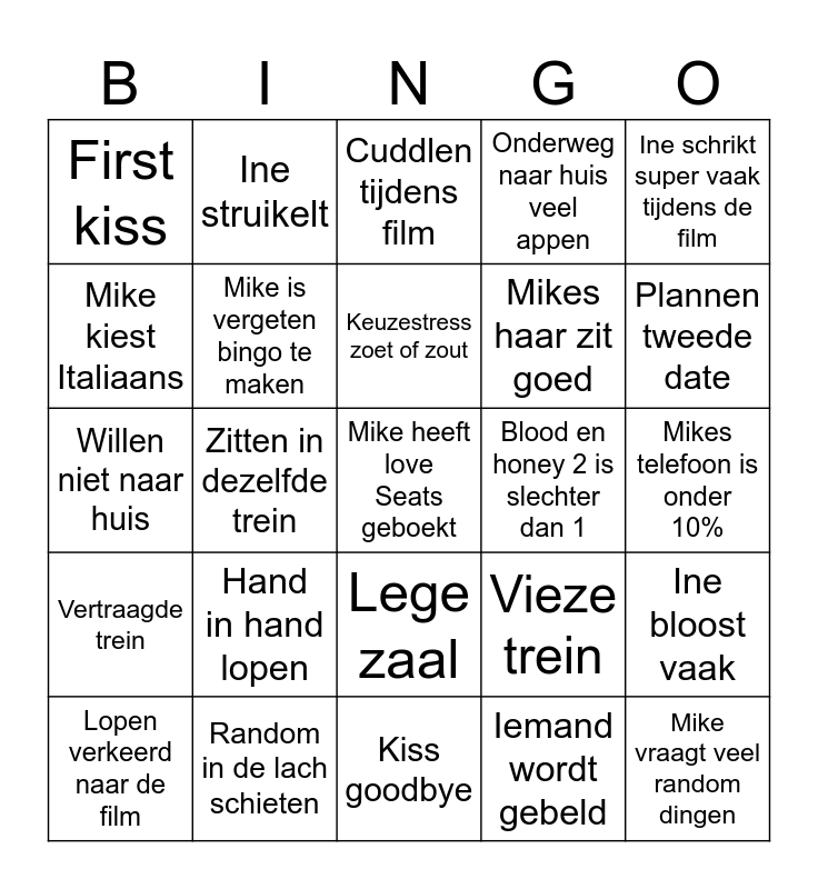 This bingo card has a free space and 24 words: Hand in hand lopen, Random in de lach schieten, Keuzestress zoet of zout, Lopen verkeerd naar de film, Ine schrikt super vaak tijdens de film, First kiss, Mike kiest Italiaans, Ine struikelt, Blood en honey 2 is slechter dan 1, Lege zaal, Mikes haar zit goed, Willen niet naar huis, Vieze trein, Ine bloost vaak, Mike is vergeten bingo te maken, Iemand wordt gebeld, Mikes telefoon is onder 10%, Cuddlen tijdens film, Plannen tweede date, Zitten in dezelfde trein, Mike vraagt veel random dingen, Vertraagde trein, Onderweg naar huis veel appen and Kiss goodbye.