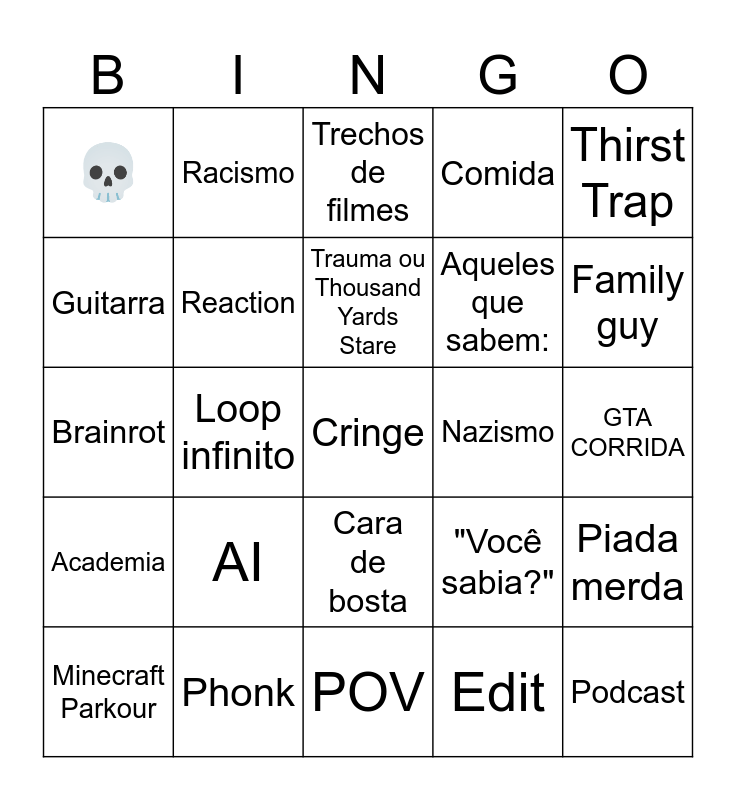 This bingo card has 25 words: Academia, Phonk, Cringe, Edit, Thirst Trap, 💀, Racismo, Trechos de filmes, Nazismo, Piada merda, Guitarra, Reaction, POV, "Você sabia?", Family guy, Minecraft Parkour, Loop infinito, Trauma ou Thousand Yards Stare, Aqueles que sabem:, GTA CORRIDA, Brainrot, AI, Cara de bosta, Comida and Podcast.