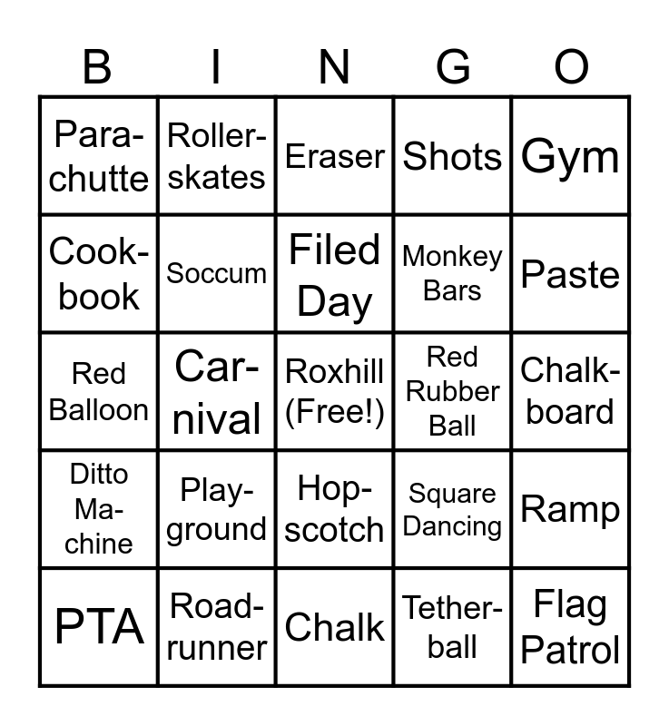 This bingo card has a free space and 24 words: Play-ground, Road-runner, Filed Day, PTA, Gym, Para-chutte, Cook-book, Roller-skates, Red Rubber Ball, Hop-scotch, Monkey Bars, Red Balloon, Square Dancing, Ramp, Soccum, Tether-ball, Chalk-board, Eraser, Paste, Car-nival, Flag Patrol, Ditto Ma-chine, Shots and Chalk.