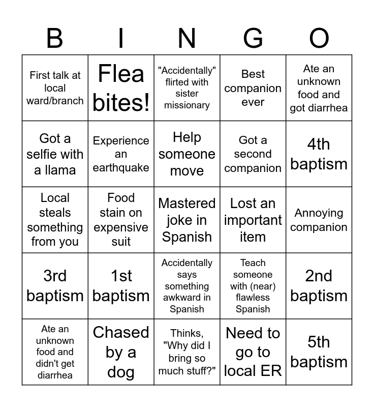 This bingo card has a free space and 24 words: 1st baptism, Chased by a dog, Help someone move, Ate an unknown food and didn't get diarrhea, Ate an unknown food and got diarrhea, First talk at local ward/branch, Got a selfie with a llama, Flea bites!, Lost an important item, Accidentally says something awkward in Spanish, Got a second companion, Local steals something from you, Teach someone with (near) flawless Spanish, 2nd baptism, Experience an earthquake, Need to go to local ER, Annoying companion, "Accidentally" flirted with sister missionary, 4th baptism, Food stain on expensive suit, 5th baptism, 3rd baptism, Best companion ever and Thinks, "Why did I bring so much stuff?".