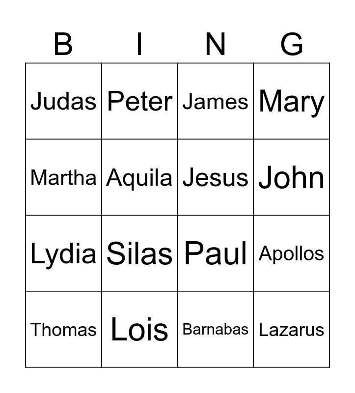 This bingo card has 21 words: Lois, Matthew, Peter, Eunice, Barnabas, Jesus, Judas, James, Paul, John, Lydia, Mary, Lazarus, Priscilla, Aquila, Timothy, Thomas, Silas, Martha, Apollos and Matthias.