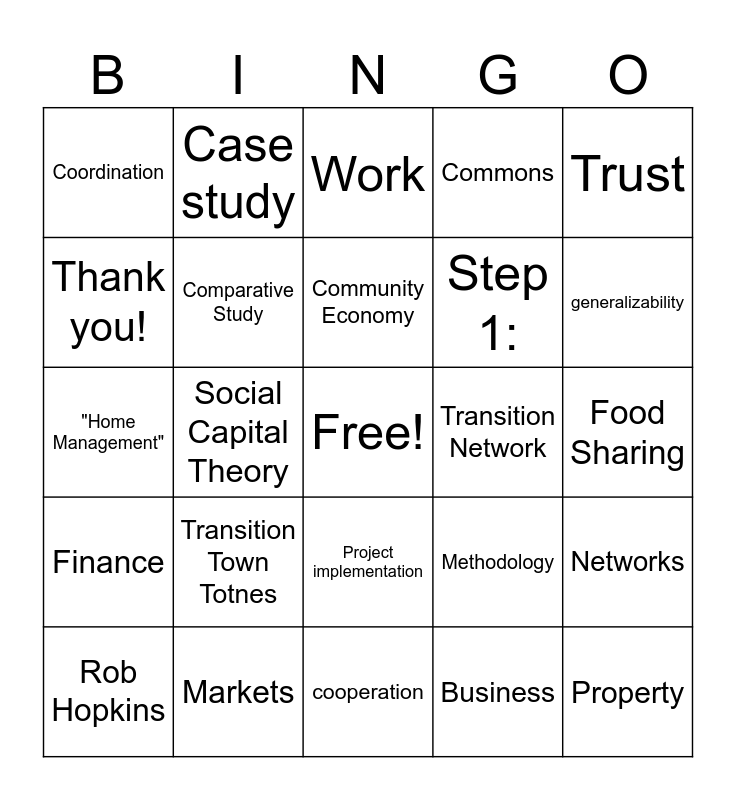 This bingo card has a free space and 24 words: Transition Town Totnes, Markets, Community Economy, Rob Hopkins, Trust, Coordination, Thank you!, Case study, Transition Network, Project implementation, Step 1:, "Home Management", Methodology, Networks, Comparative Study, Business, Food Sharing, Work, generalizability, Social Capital Theory, Property, Finance, Commons and cooperation.