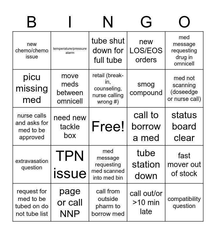 This bingo card has a free space and 53 words: missing lipid/adjust lipid time, compatibility question, can I crush/does this go in a gtube, call out/or >10 min late, TPN issue, stat alteplase, temperature/pressure alarm, new crrt/PD, picu missing med, nurse has <1 hour on a drip, move meds between omnicell, med request for order put in <10 min ago, fast mover out of stock, tube station down, page on call, request for med to be tubed on do not tube list, retail (break-in, counseling, nurse calling wrong #), call to borrow a med, forgot ab med in hazard room, med message requesting drug in omnicell, need new tackle box, expired compound, smog compound, new chemo/chemo issue, premix station with >5 to prep, page or call NNP, rec from a consult service, med sent secure returns in tube, omnicell discrepancy, med not scanning (doseedge or nurse call), trauma pager goes off, expired med (not compound), call from OR, new DKA needs bags STAT, doseedge bypass, brand new TPN, new LOS/EOS orders, call from outside pharm to borrow med, tube shut down for full tube, request for vfc vaccine, recon antibiotic, ID home med, status board clear, request for on call electrolytes, omnicell issue, med message requesting med scanned into med bin, phone call from MD needing dose recommendation, critical dose warning override, nurse calls and asks for med to be approved, extravasation question, Door bell to pharmacy, IV room calls out for stock and DE rework.
