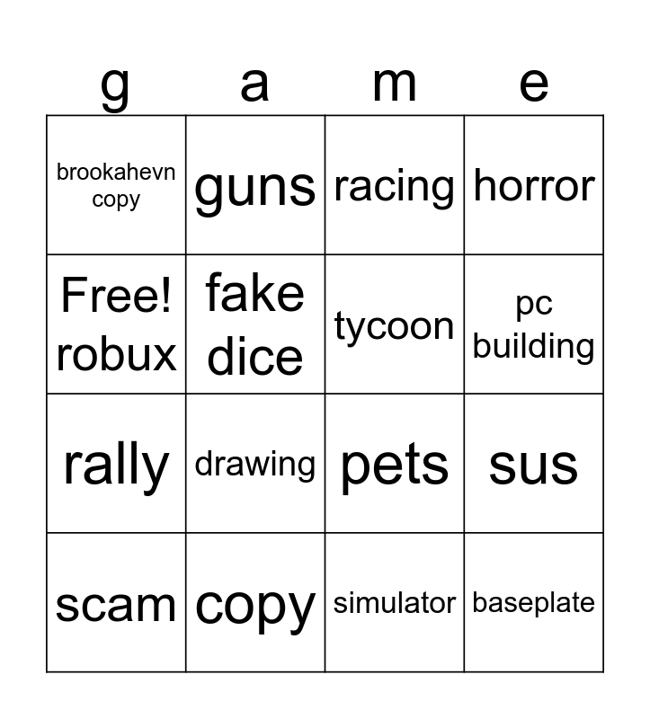 This bingo card has 16 words: copy, sus, racing, brookahevn copy, rally, guns, pets, simulator, Free! robux, fake dice, scam, horror, drawing, pc building, tycoon and baseplate.