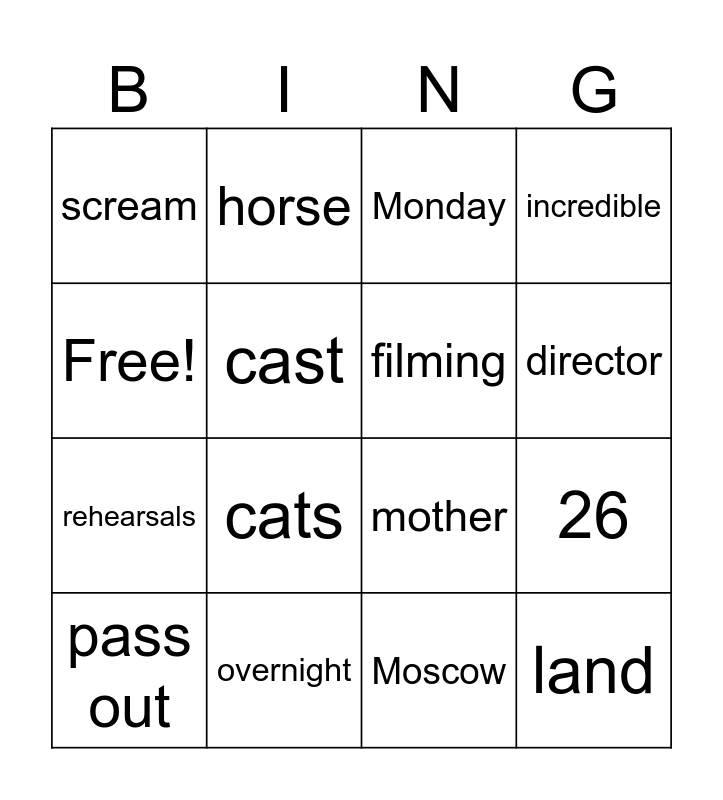 This bingo card has 16 words: overnight, 26, Monday, scream, rehearsals, horse, mother, Moscow, Free!, cast, pass out, incredible, cats, director, filming and land.