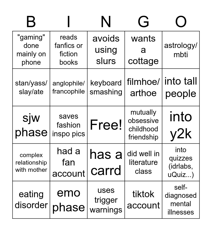 This bingo card has a free space and 24 words: had a fan account, emo phase, keyboard smashing, eating disorder, astrology/ mbti, "gaming" done mainly on phone, stan/yass/ slay/ate, reads fanfics or fiction books, mutually obsessive childhood friendship, has a carrd, filmhoe/ arthoe, sjw phase, did well in literature class, into quizzes (idrlabs, uQuiz...), anglophile/ francophile, tiktok account, into y2k, avoids using slurs, into tall people, saves fashion inspo pics, self-diagnosed mental illnesses, complex relationship with mother, wants a cottage and uses trigger warnings.