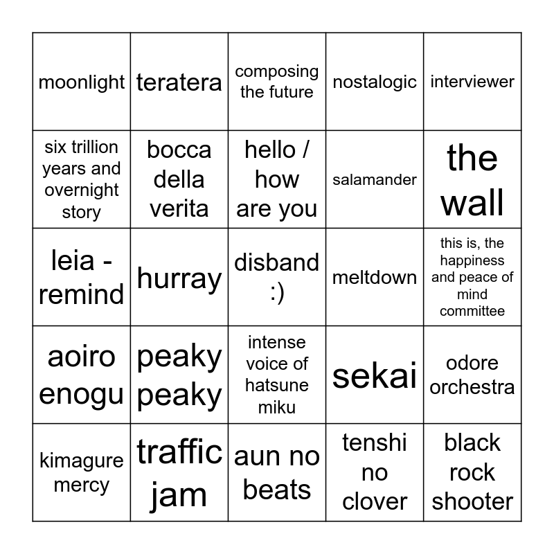 This bingo card has a free space and 24 words: peaky peaky, traffic jam, hello / how are you, kimagure mercy, interviewer, moonlight, six trillion years and overnight story, teratera, meltdown, intense voice of hatsune miku, salamander, leia - remind, sekai, odore orchestra, bocca della verita, tenshi no clover, this is, the happiness and peace of mind committee, composing the future, the wall, hurray, black rock shooter, aoiro enogu, nostalogic and aun no beats.