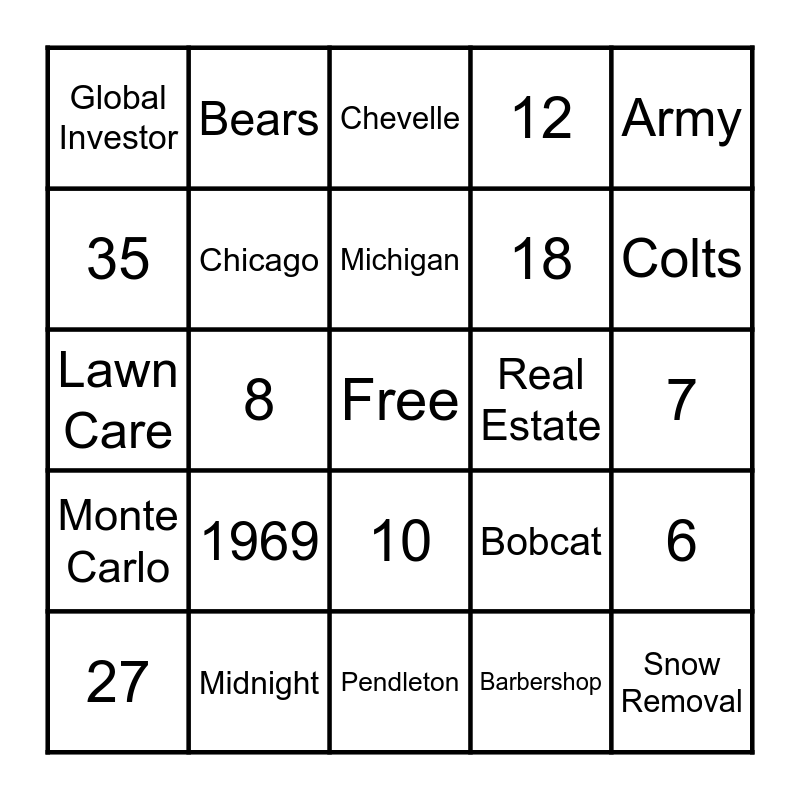 This bingo card has a free space and 24 words: 1969, Midnight, Michigan, 27, Army, Global Investor, 35, Bears, Real Estate, 10, 18, Lawn Care, Bobcat, 6, Chicago, Barbershop, 7, Chevelle, Colts, 8, Snow Removal, Monte Carlo, 12 and Pendleton.
