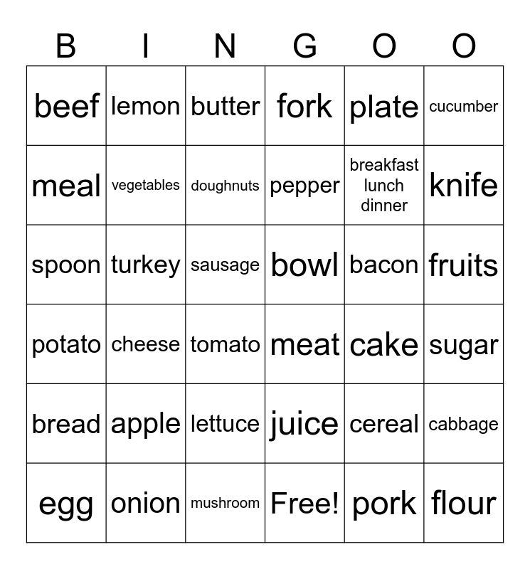 This bingo card has 41 words: Free!, breakfast lunch dinner, dessert, meal, meat, fruits, vegetables, nuts, plate, bowl, knife, fork, spoon, sausage, turkey, bacon, egg, beef, pork, butter, cheese, bread, cake, doughnuts, flour, cereal, sugar, salt, pepper, apple, cherries, lemon, tomato, onion, potato, cucumber, lettuce, cabbage, mushroom, juice and honey.