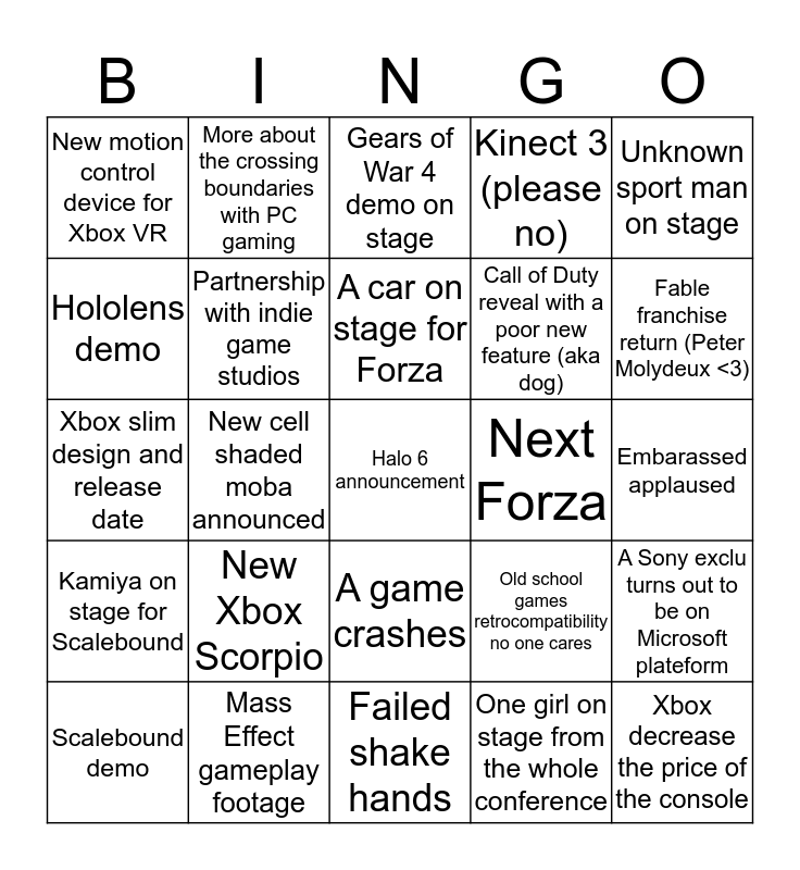 This bingo card has 25 words: New Xbox Scorpio, Failed shake hands, A car on stage for Forza, Scalebound demo, Unknown sport man on stage, New motion control device for Xbox VR, Hololens demo, More about the crossing boundaries with PC gaming, Next Forza, A game crashes, Call of Duty reveal with a poor new feature (aka dog), Xbox slim design and release date, Old school games retrocompatibility no one cares, A Sony exclu turns out to be on Microsoft plateform, Partnership with indie game studios, Xbox decrease the price of the console, Embarassed applaused, Gears of War 4 demo on stage, Fable franchise return (Peter Molydeux <3), New cell shaded moba announced, Halo 6 announcement, Mass Effect gameplay footage, Kamiya on stage for Scalebound, Kinect 3 (please no) and One girl on stage from the whole conference.