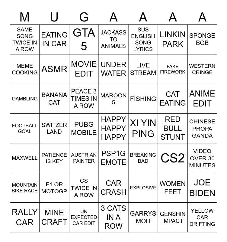 This bingo card has a free space and 48 words: EXPLOSIVE, FAKE FIREWORK, 3 CATS IN A ROW, SWITZER LAND, PEACE 3 TIMES IN A ROW, CHINESE PROPA GANDA, EATING IN CAR, MINE CRAFT, LINKIN PARK, PSP1G EMOTE, SPONGE BOB, JACKASS TO ANIMALS, CAT EATING, FISHING, MOUNTAIN BIKE RACE, RED BULL STUNT, MEME COOKING, WESTERN CRINGE, WOMEN FEET, SUS ENGLISH SONG LYRICS, LIVE STREAM, PUBG MOBILE, SAME SONG TWICE IN A ROW, ASMR, JOE BIDEN, MOVIE EDIT, ANIME EDIT, RALLY CAR, MAROON 5, BANANA CAT, GENSHIN IMPACT, XI YIN PING, VIDEO OVER 30 MINUTES, F1 OR MOTOGP, FOOTBALL GOAL, BREAKING BAD, CS2, GAMBLING, AUSTRIAN PAINTER, CS TWICE IN A ROW, MAXWELL, YELLOW CAR DRIFTING, GTA 5, UN EXPECTED CAR EDIT, UNDER WATER, CAR CRASH, PATIENCE IS KEY and GARRYS MOD.
